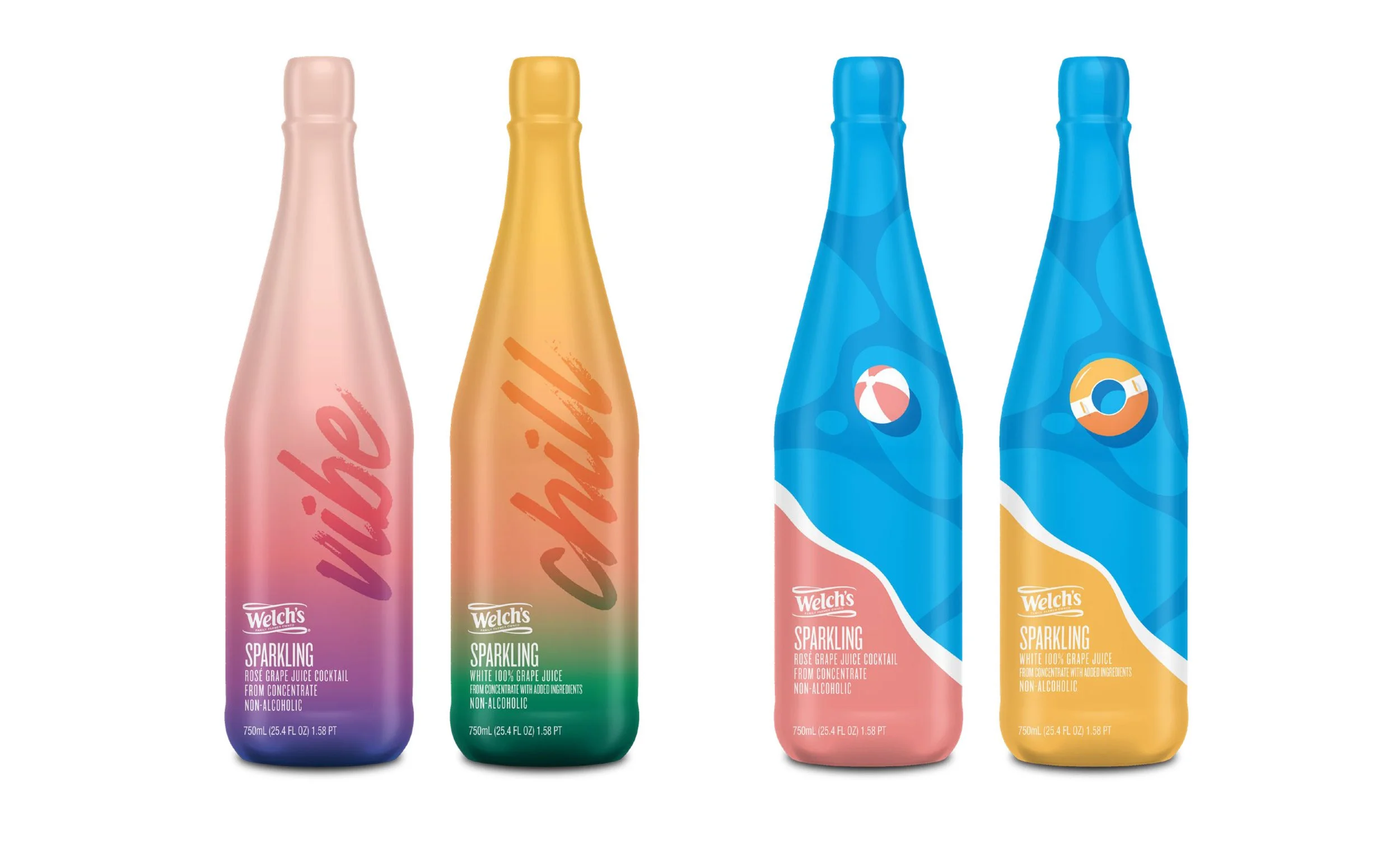 These concepts for Welch’s single-serve sparkling bottles range from close in to further out. The goal was to reach a younger audience by jumping into the growing trend of seltzers and flavored waters.